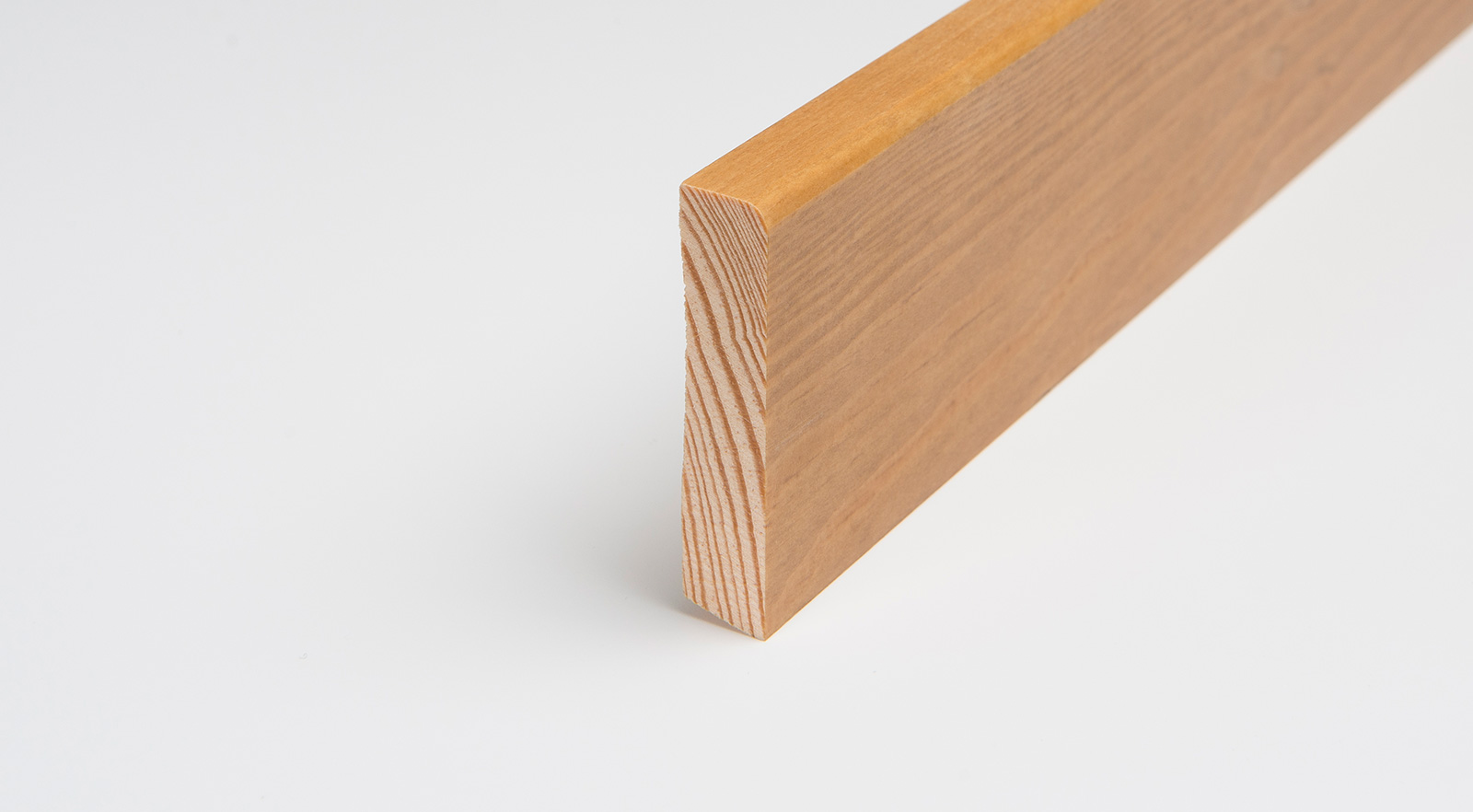 Sockeln är tillverkad av kvistfri furu och kan beställas obehandlad eller färdigbehandlad i valfri kulör. För att minimera miljöpåverkan är ytbehandlingen vattenbaserad. Listen på bilden är eklaserad.